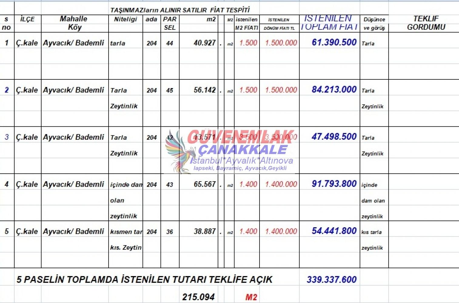 Çanakkale ili Ayvacık İlçesi, Bedemli Mevkiinde komple deniz ve midilli manzaralı 204 adA 44, parsel 41.000.-M2 ile aynı bölgede hem tarla vasfında hemde arsa vasfında SATILIK muhtelif yerlerimiz mevcuttur. Bahse konu tarlalar tek tek veya komple de SATILIKTIR.
