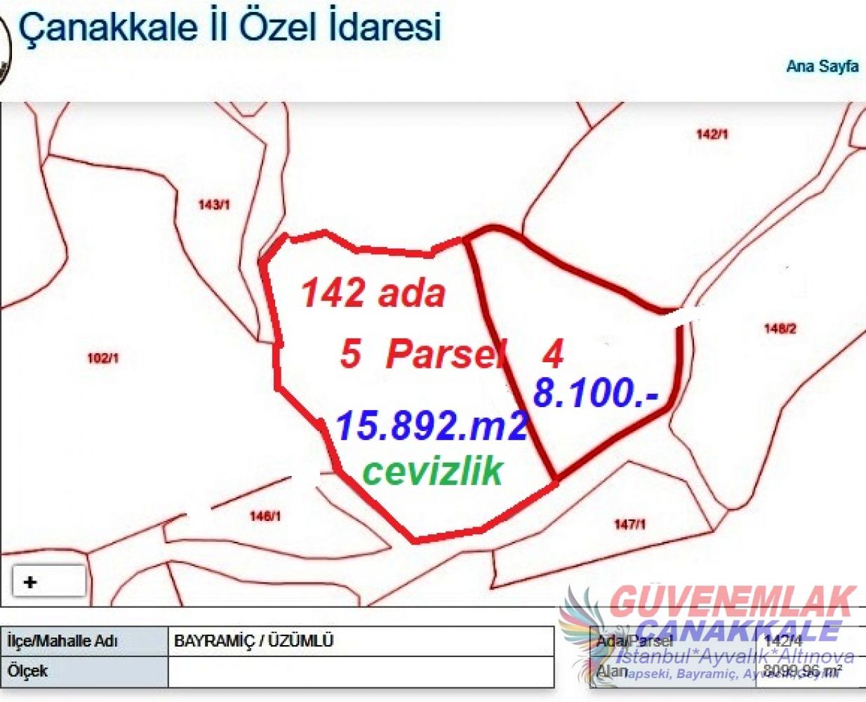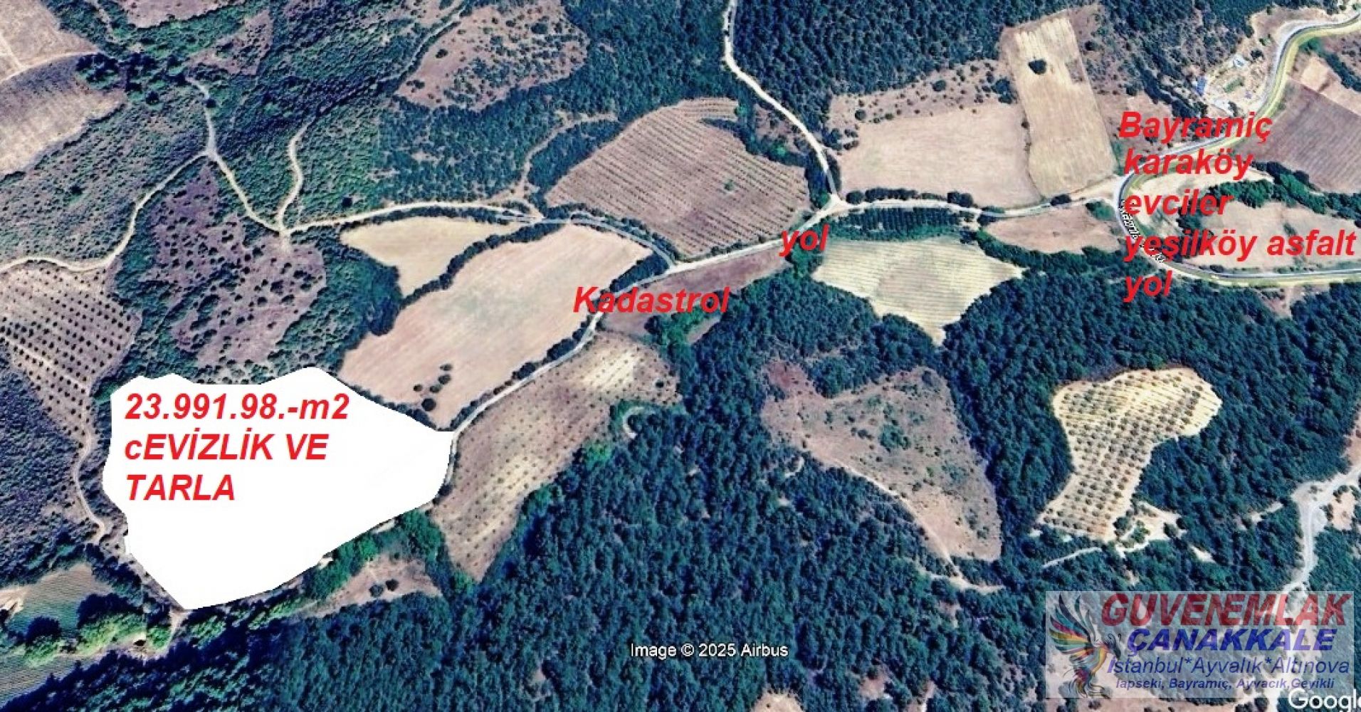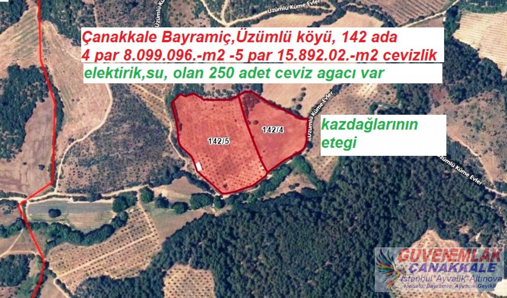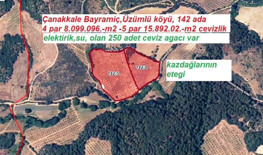 Çanakkale, Bayramiç, Üzümlü Köyü Ayazma yolu yakını Bayramiç Baralj üstü 24.000.-m2 tarla ve CEVİZLİK
